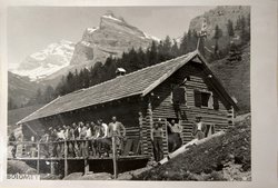 - La cantine sur le fronton on peut lire 1942 ainsi que quelques initiales. Il y avait le téléphone. En arrière-plan la Dent de Chamosentse et le Grd Muveran. Le bâtiment aurait été emporté par une avalanche l’hiver 44 45 sans faire de victimes, la mine ayant été abandonnée auparavant.