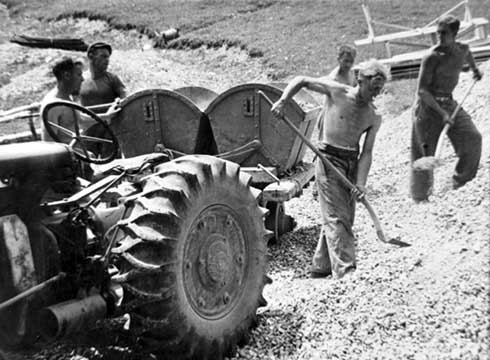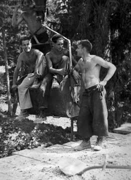 - On remarque une poulie derrière l’homme de gauche et deux câbles de grosse section au sol.