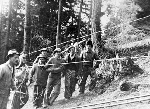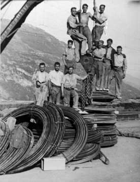 - Il est probable que le câble est d’une seule longueur mais divisée en plusieurs torons portés par les ouvriers.