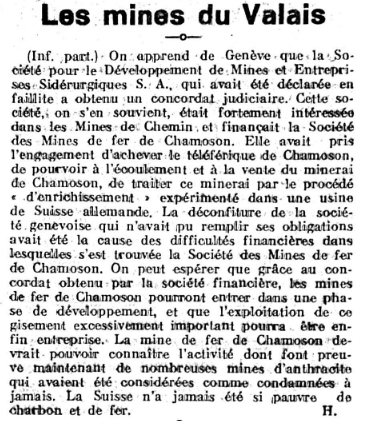 La mise en faillite de la société minière quelques années plus tard aurait été en partie due à ces constructions démesurées proportionnellement au rapport de la mine. La Société Pour Le Développement De Mines Et Entreprises Sidérurgiques S.A. qui était impliquée dans la Société Des Mines De Fer de Chamoson a obtenu un sursis judiciaire en 1945.