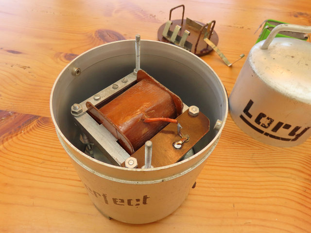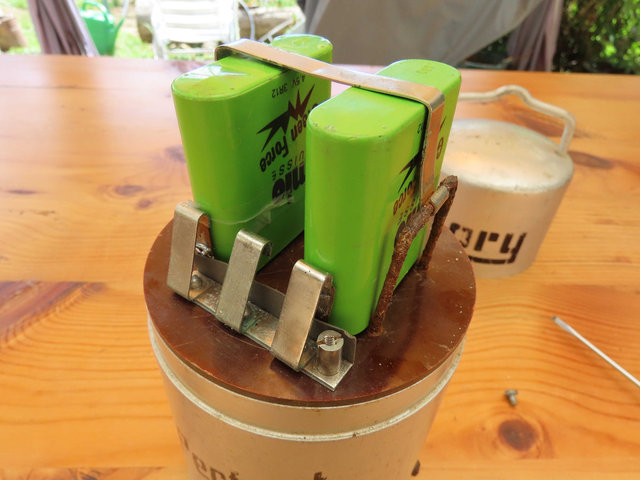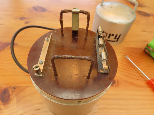 Tout d’abord j’enlève les 2 vis supérieures pour ôter le couvercle, et voici qu’apparaît le compartiment destiné aux piles d’alimentation électrique. Apparemment il y a eu corrosion des supports due à un écoulement de celle-ci. Le disque inférieur est en anhydrure de polyoxybenzylméthylèneglycol plus connu sous le nom de Bakélite. Selon Wikipedia la Bakélite fut largement utilisée jusque vers 1950 [1]