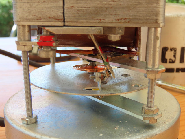 En enlevant le cylindre on accède à un mécanisme en forme de disque légèrement tendu par un ressort et muni d’un contact.