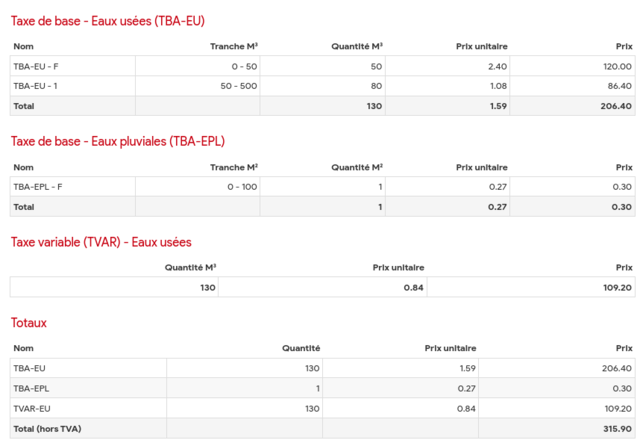 - Taxe variable (facturée au m3 consommé)
