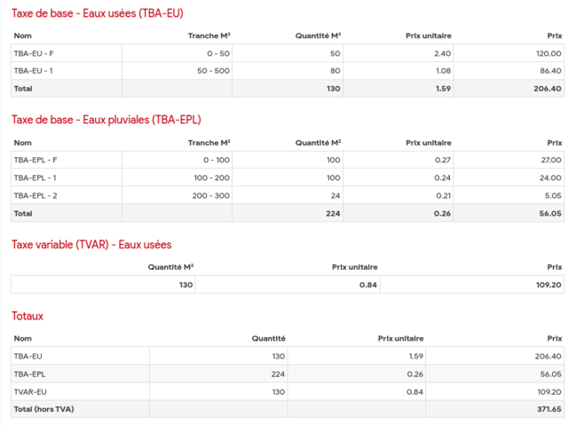 - Taxe de base eaux usées (basée sur la consommation au compteur d’eau avec un minimum de 50 m3) soit de 150 à 250 fr selon le tarif appliqué puis tarif dégressif (plus on consomme moins on paie, pas très logique le coût réel de traitement est le même pour un petit ou un gros consommateur !)