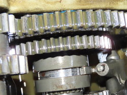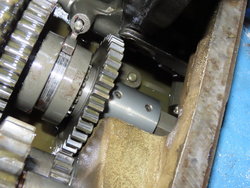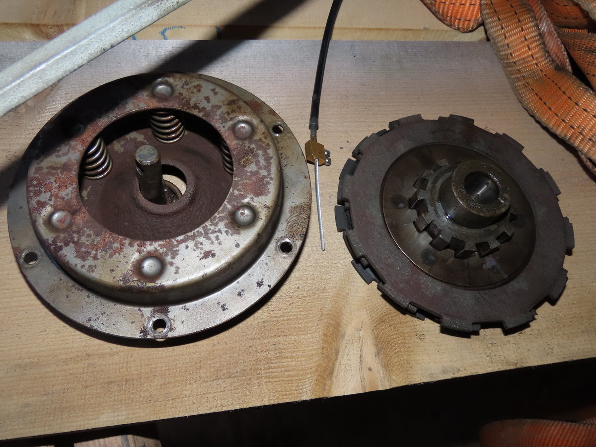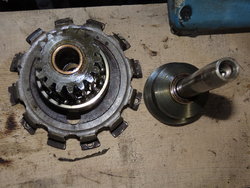 - A droite l’axe d’entraînement à la sortie du moteur, a gauche cloche d’embrayage et pignon d’entraînement principal