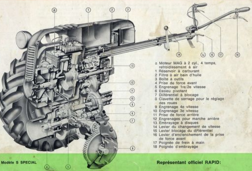 - La rotation du tambour associée au levier boule commande les vitesses. Les deux leviers commandent pour un le blocage du différentiel et pour l’autre la prise de force avant.
